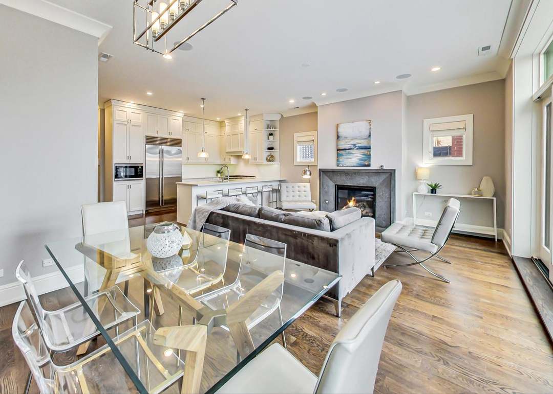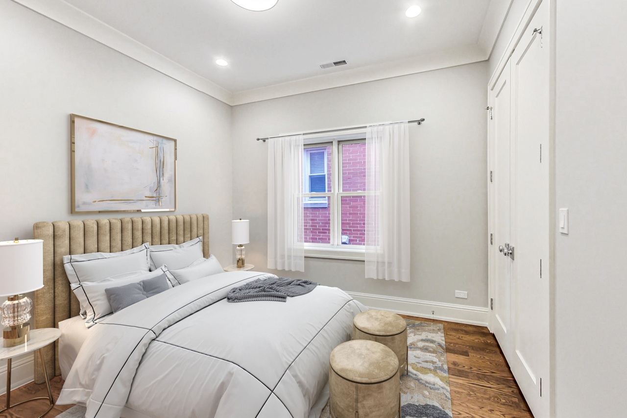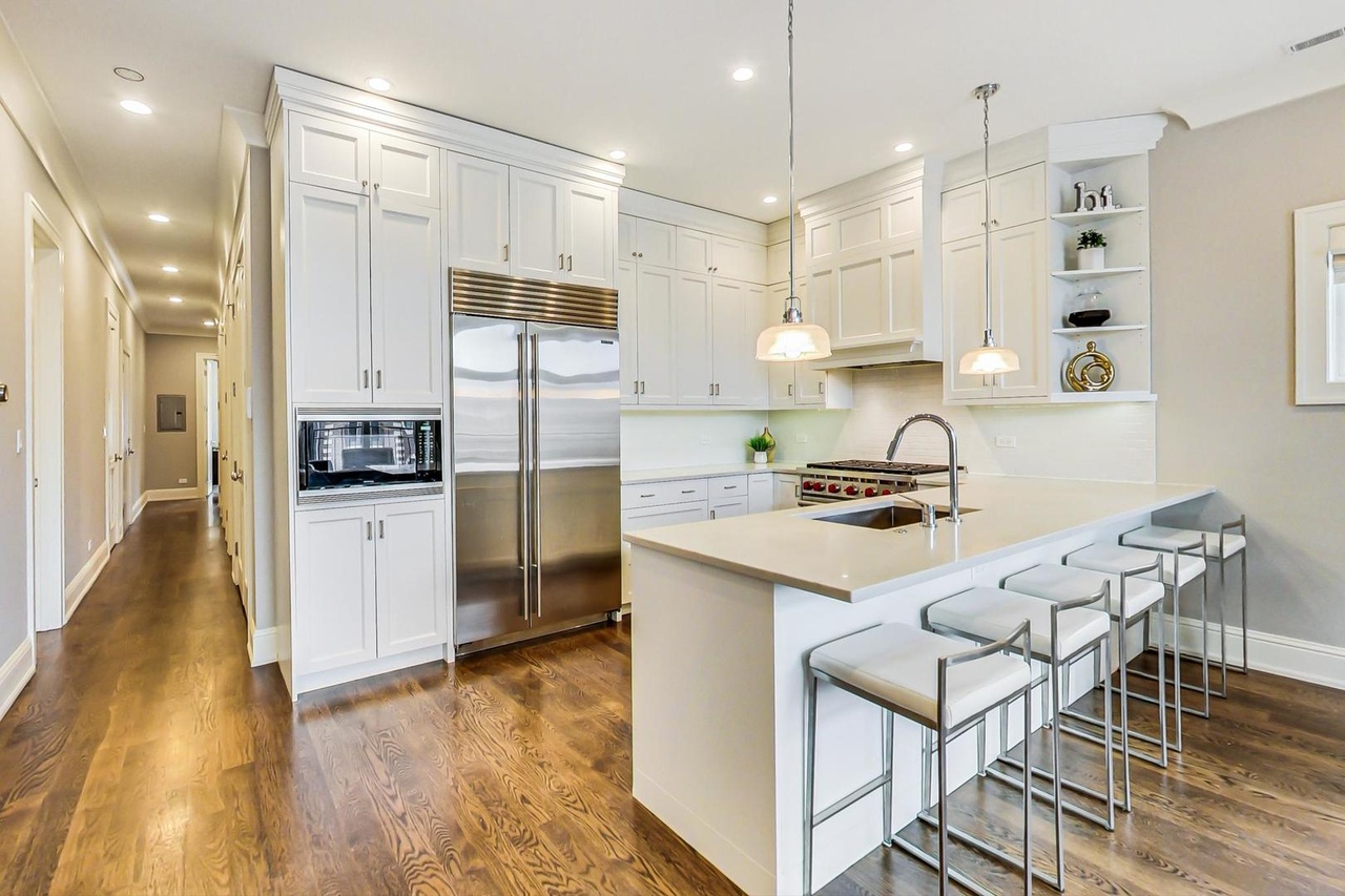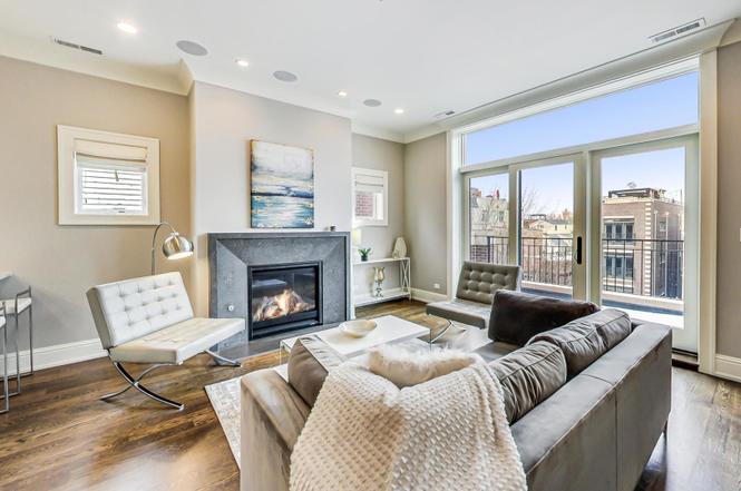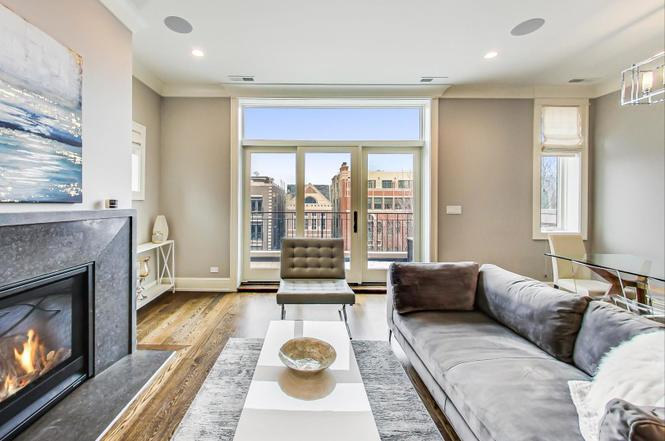 This sun-filled 3-bedroom, 2-bath penthouse, built in 2016 by Hastings Builders, offers refined design and modern convenience in the heart of East Lakeview. The wide living and dining area features a custom marble fireplace, 4-inch white oak flooring, and detailed millwork. The chef’s kitchen includes Sub-Zero, Wolf, and Asko appliances, quartzite countertops, and full-height cabinetry.
